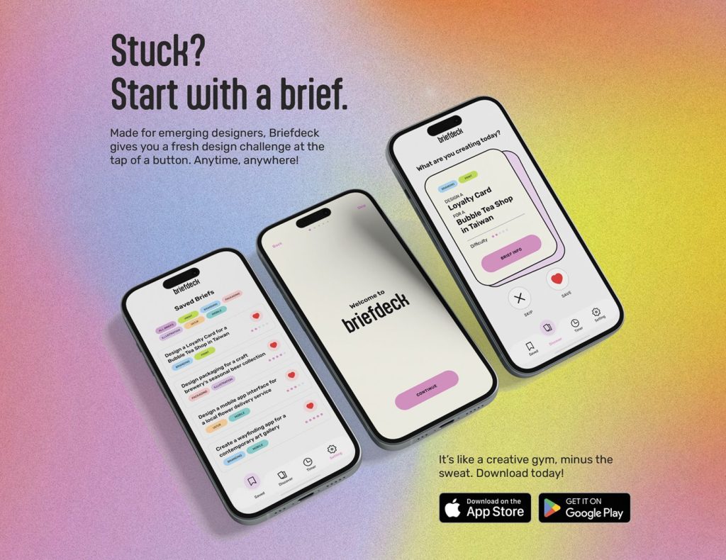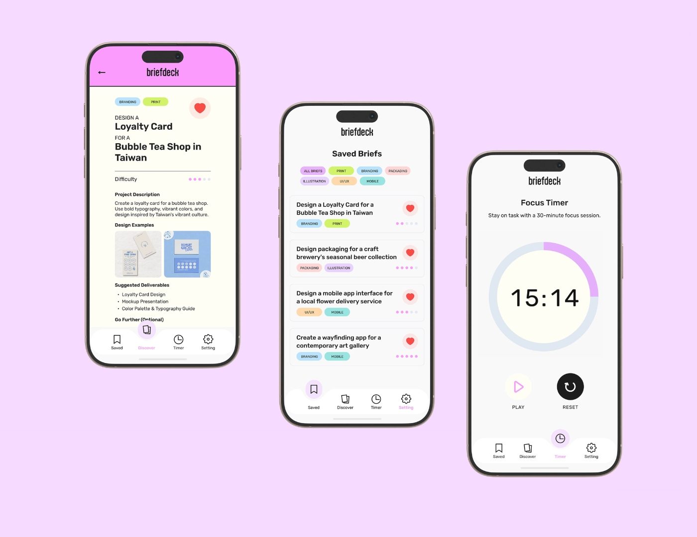 Briefdeck is a mobile app that helps design students discover and complete portfolio-worthy projects. Unlike desktop-based brief generators, it’s built for Gen Z’s mobile-first lifestyle – letting students swipe through curated design prompts during commutes, study breaks, or downtime. The app features skill-based filtering to find relevant briefs, a personal library to save interesting projects, and integrated focus tools to encourage completion. Through user research with design students, the key pain points were identified around idea generation and project follow-through, then designed a solution that fits seamlessly into their existing smartphone workflows.