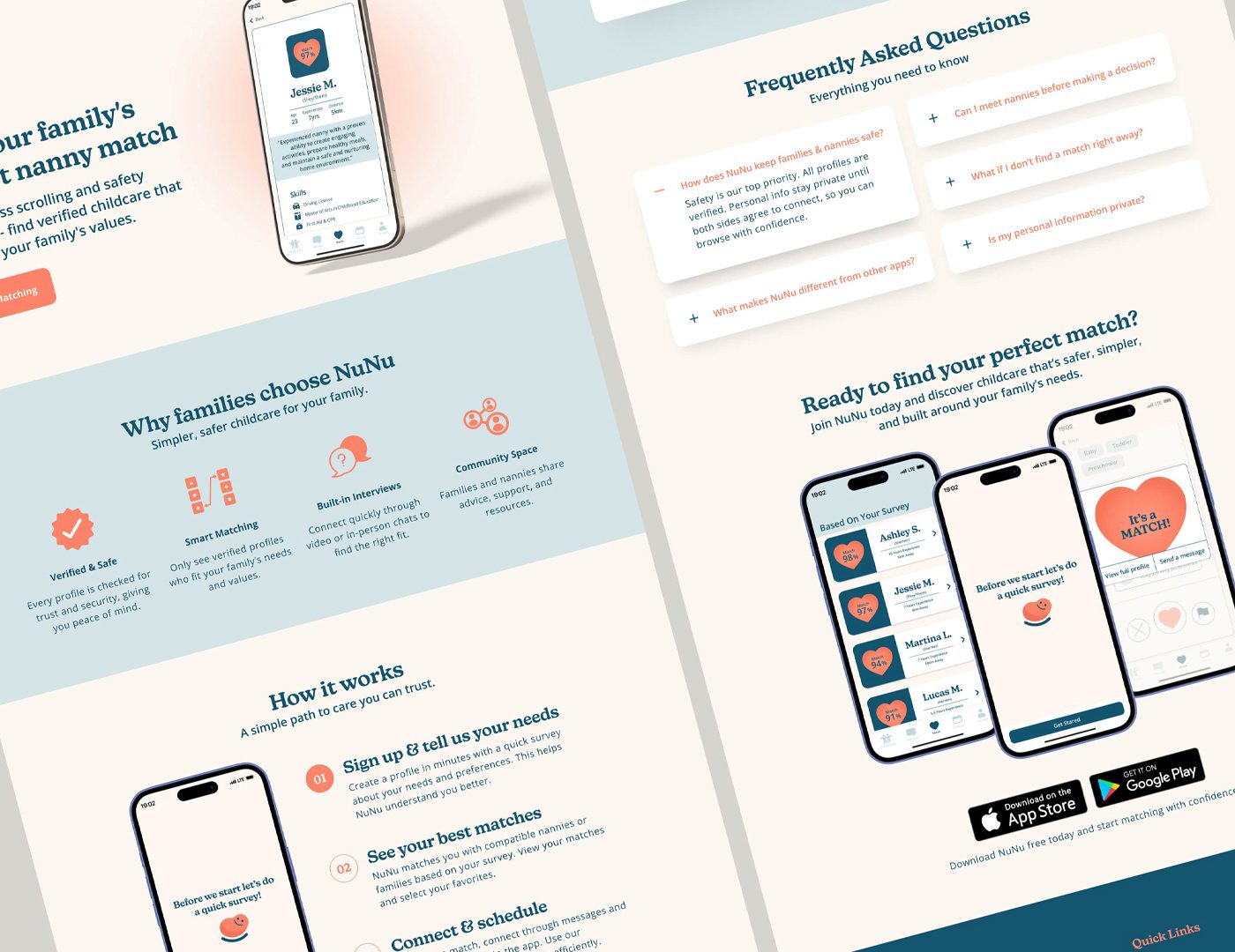 Kisty designed a landing page for the creators of the NuNu Childcare App. The goal was creating a landing page that helps parents feel confident about finding childcare through an app. After looking at their research she was able to create a page that walks parents through exactly how they’d find a nanny, because that’s what they really want to understand before downloading anything. The design addresses their biggest concerns upfront: safety and trust. Then the website guides them through the matching process step by step, including testimonials from other parents, and answer common questions in an FAQ section. The whole experience feels warm and reassuring because finding someone to care for your kids is such a personal, vulnerable decision.