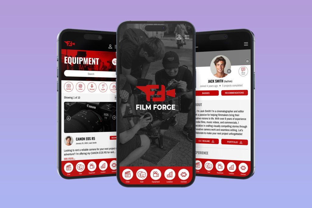 FilmForge is an app designed for filmmakers in Vancouver to easily find cast, crew, locations, and equipment in one place. For this project, we created the full UI/UX design entirely in Figma and developed the branding separately. The app combines creativity and functionality with an intuitive interface to streamline collaboration and make project management simpler for filmmakers.