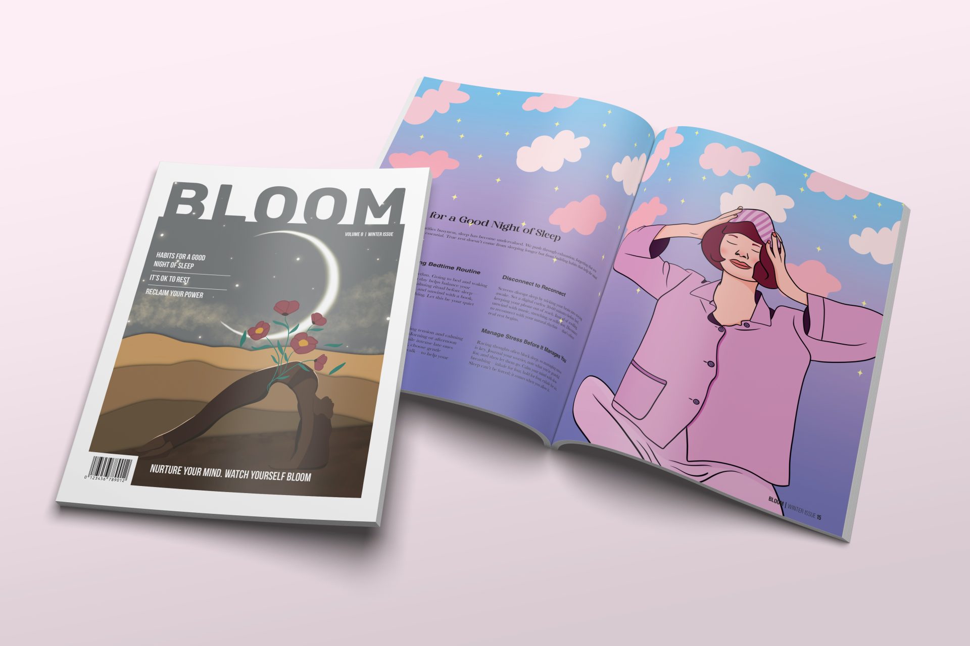 This project involved developing an editorial grid system and illustrations for BLOOM, a magazine focused on mental health and wellness. The goal was to create a visually engaging publication that attracts attention and encourages reader engagement, with a easy to read and clean layout.